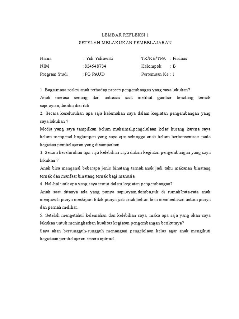 Nur Musfirah Binti Mustak Ahmad. Refleksi dan ucapan penutupan serta bersurai. Berikut yang dapat admin bagikan terkait contoh lembar refleksi setelah melakukan pembelajaran di paud.
